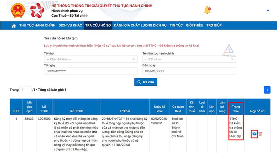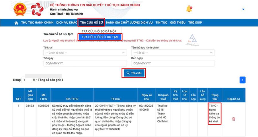 ➧ Kiểm tra “Trạng thái” sẽ hiện “TTHC - Đang kiểm tra thông tin kê khai”;