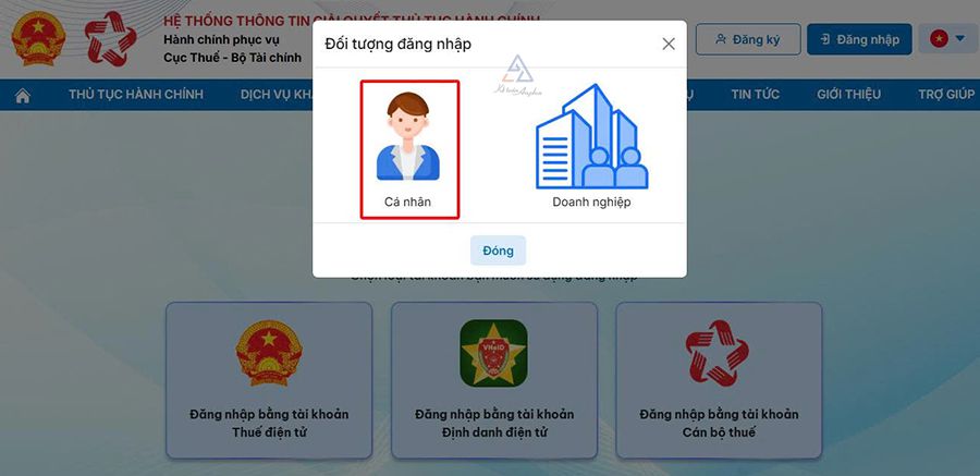 ➧ Chọn biểu tượng “Đăng nhập bằng tài khoản Thuế điện tử” hoặc “Đăng nhập bằng tài khoản định danh điện tử” ➜ Chọn “Cá nhân”;