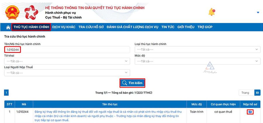 ➧ Vào chức năng “Thủ tục hành chính” ➜ Nhập “Mã thủ tục hành chính 1.010244”➜ Ấn “Tìm kiếm” ➜ Chọn biểu tượng “Nộp hồ sơ”;