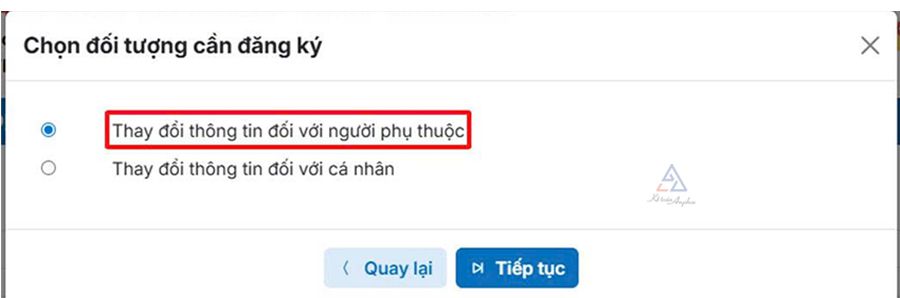 ➧ Chọn “Thay đổi thông tin đối với người phụ thuộc” ➜ Ấn “Tiếp tục”;
