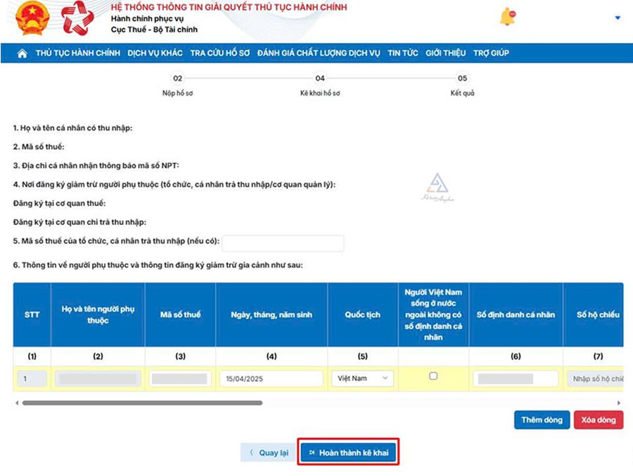 ➧ Thêm dòng nếu có từ 2 NPT trở lên cần thay đổi thông tin ➜ Ấn “Hoàn thành kê khai”;