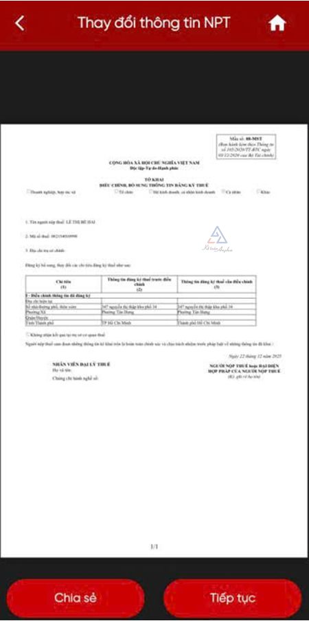 ➧ Kiểm tra lại thông tin thay đổi trên tờ khai theo mẫu biểu 08-MST ➜ Ấn "Tiếp tục" để hoàn thành thủ tục kê khai.