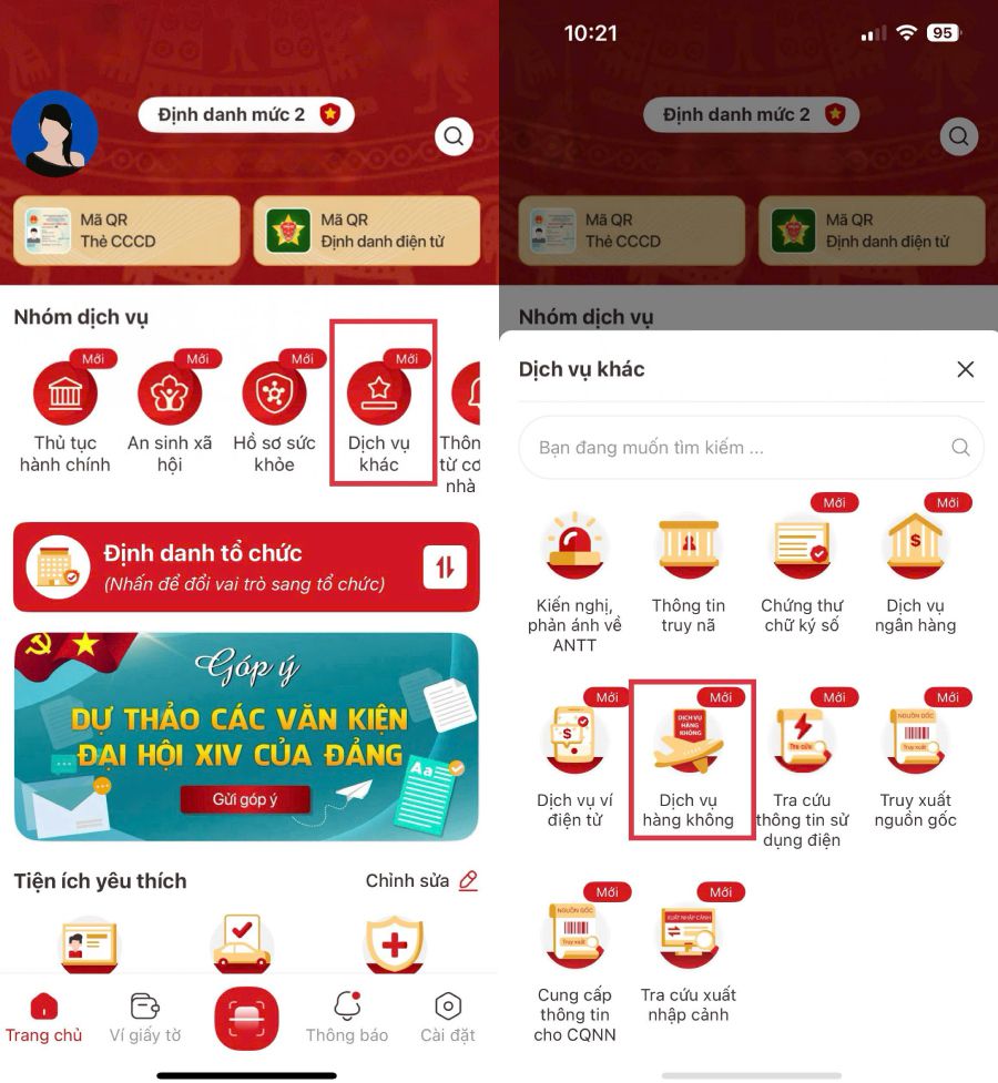 5. Tính năng dịch vụ hàng không trên ứng dụng VNeID gồm những gì?