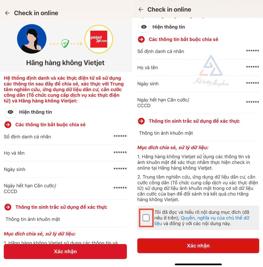 Ở bước này, bạn cần kiểm tra kỹ các thông tin như họ tên, ngày tháng năm sinh và mã số CCCD. Sau khi nhấn “Xác nhận” và chọn vào ô “Tôi đã đọc và hiểu rõ nội dung mục đích…”, màn hình điện thoại sẽ được tự động chuyển sang app của hãng hàng không tương ứng.