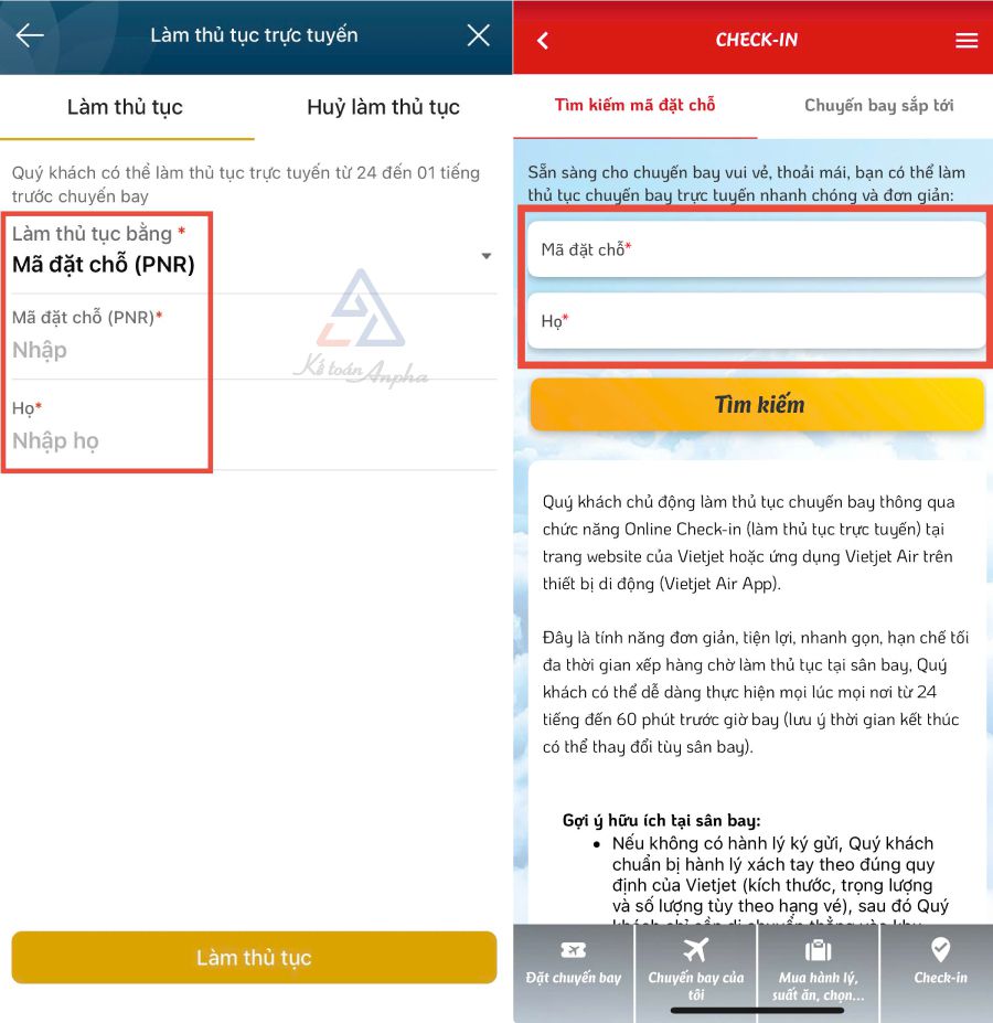 Đối với giao diện app, phía dưới góc phải sẽ có mục “Làm thủ tục” hoặc “Check in”, bạn nhấn vào để chuyển sang bước kế tiếp.