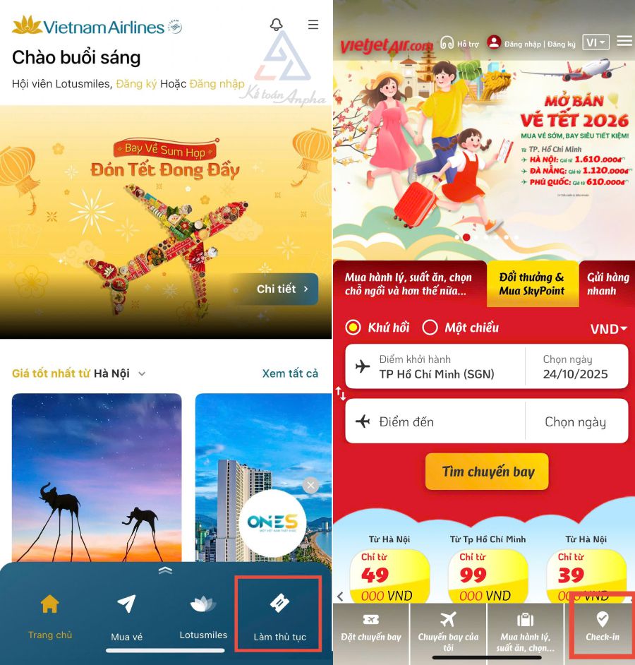 Hướng dẫn 3 cách check in online máy bay (làm thủ tục bay nội địa không hành lý ký gửi): check in bay nội địa VNeID, kiosk & app Vietjet Air, Vietnam Airlines.