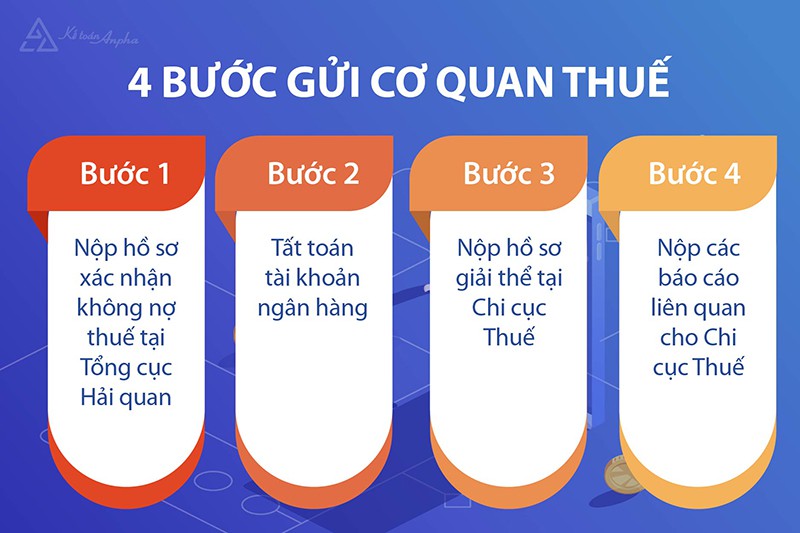 - 4 bước gửi cơ quan thuế bao gồm: Bước 1 - Nộp hồ sơ xin xác nhận không nợ thuế tại Tổng cục Hải quan; Bước 2 - Tất toán tài khoản ngân hàng tại ngân hàng công ty mở tài khoản; Bước 3 - Nộp hồ sơ giải thể tại Chi cục Thuế; Bước 4 - Nộp các báo cáo liên quan cho Chi cục Thuế.