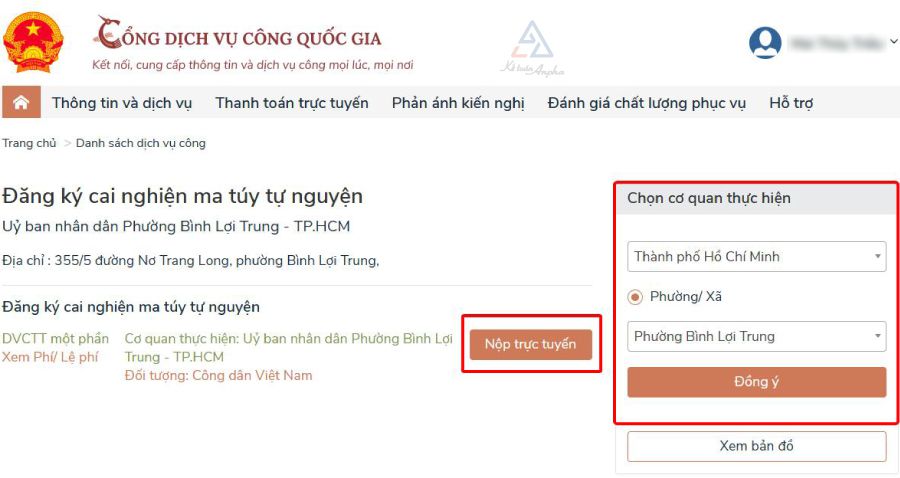 ➧ Bước 3: Chọn cơ quan thực hiện và bấm “Đồng ý” sau đó chọn “Nộp trực tuyến”;