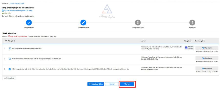 ➧ Bước 5: Tải lên bản scan các giấy tờ như trong bộ hồ sơ nộp trực tiếp và bấm “Tiếp tục”;
