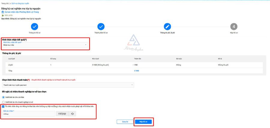 ➧ Bước 6: Chọn hình thức nhận kết quả ➜ tích chọn ô “Tôi chắc chắn…” ➜ nhập mã xác nhận và bấm “Nộp hồ sơ” để hoàn tất đăng ký.