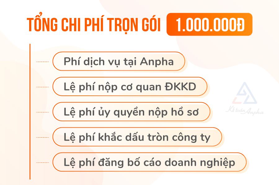 Với dịch vụ đăng ký làm giấy phép kinh doanh tại Anpha, tổng chi phí từ 1.000.000 đồng, đã bao gồm các hạng mục như là: