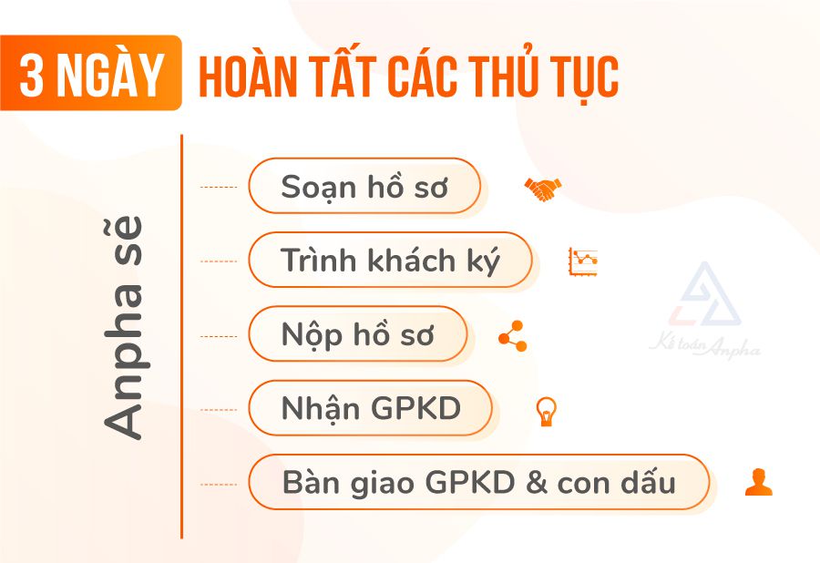 Thông thường nếu tự làm, doanh nghiệp sẽ mất từ 5 - 7 ngày để chuẩn bị, nộp hồ sơ và chờ kết quả từ Sở Tài chính. Nhưng với dịch vụ đăng ký giấy phép kinh doanh, Anpha đảm bảo xong các thủ tục từ 3 ngày. Sau đó, Anpha sẽ nhận giấy phép cùng con dấu và bàn giao tận nhà bạn.
