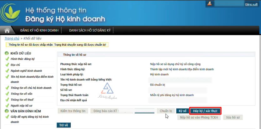 ➧ Bước 7: Chọn “Hủy ký/Xác nhận” và tiến hành ký xác thực hồ sơ đăng ký hộ kinh doanh;