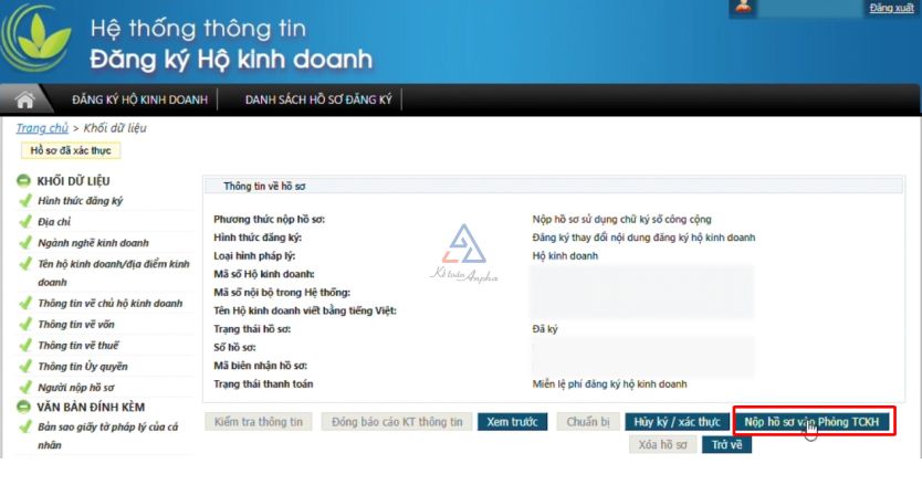 ➧ Bước 8: Sau khi ký xác thực, bạn chọn “Nộp hồ sơ Phòng TCKH” để hoàn tất thủ tục đăng ký mở hộ kinh doanh.