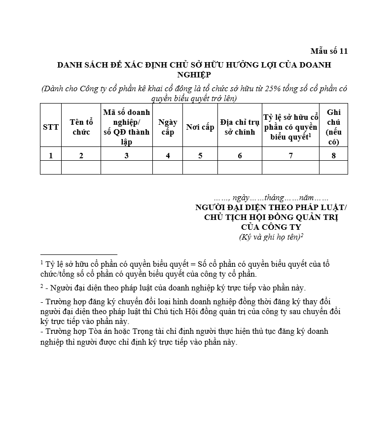 Mẫu danh sách để xác định chủ sở hữu hưởng lợi của doanh nghiệp