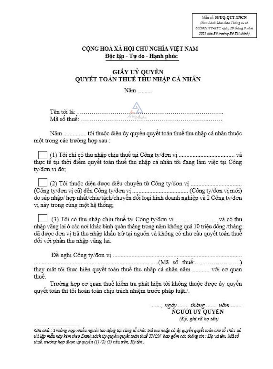- Bước 1: Chuẩn bị giấy ủy quyền quyết toán thuế thu nhập cá nhân theo mẫu số 08/UQ-QTT-TNCN ban hành kèm theo Thông tư 80/2021/TT-BTC;