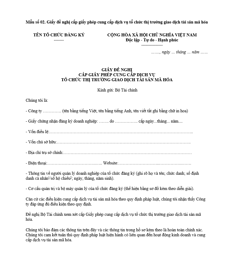 Mẫu số 02 - Giấy đề nghị cấp giấy phép cung cấp dịch vụ tổ chức thị trường giao dịch tài sản mã hóa
