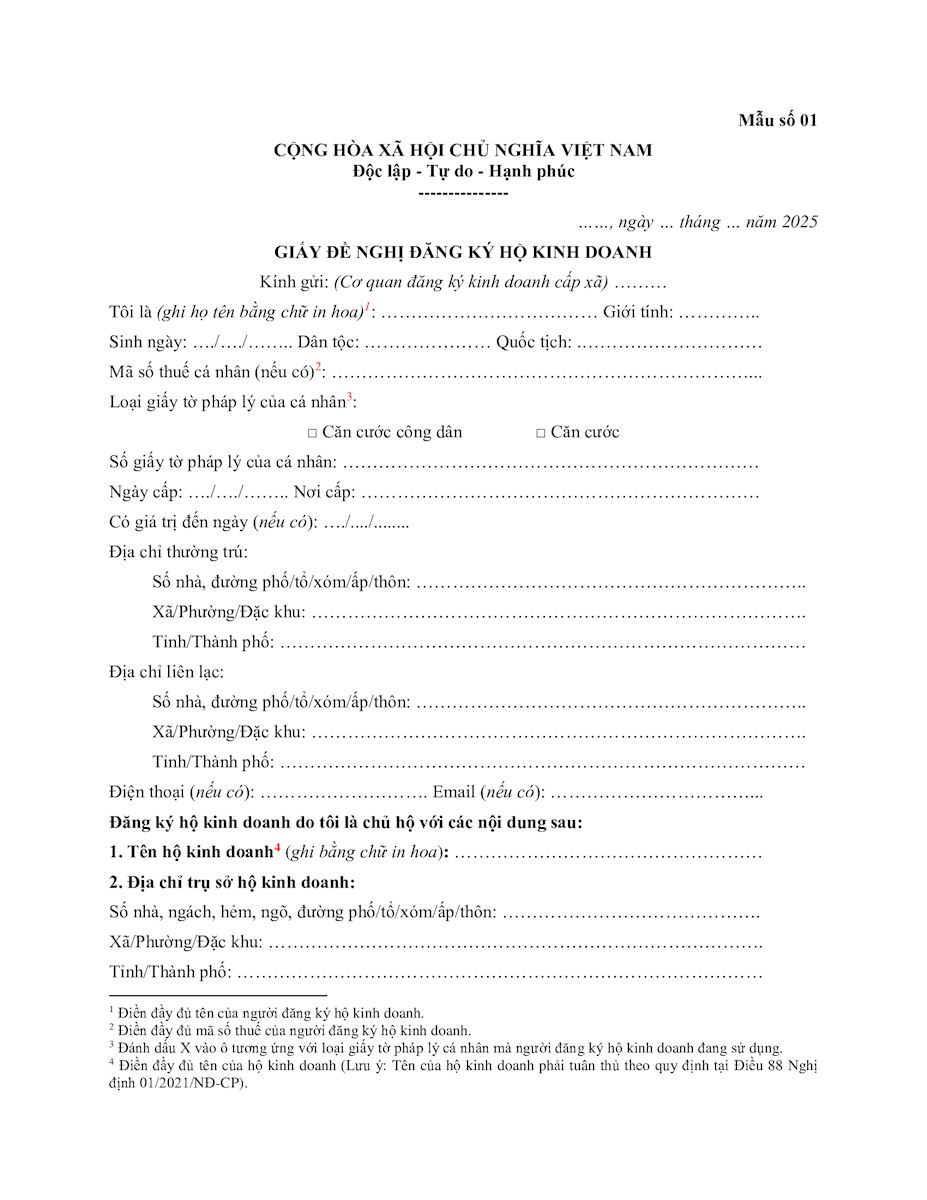 Phụ lục I -1: Giấy đề nghị đăng ký hộ kinh doanh theo Thông tư 43/2025/TT-BTC (Mới nhất)