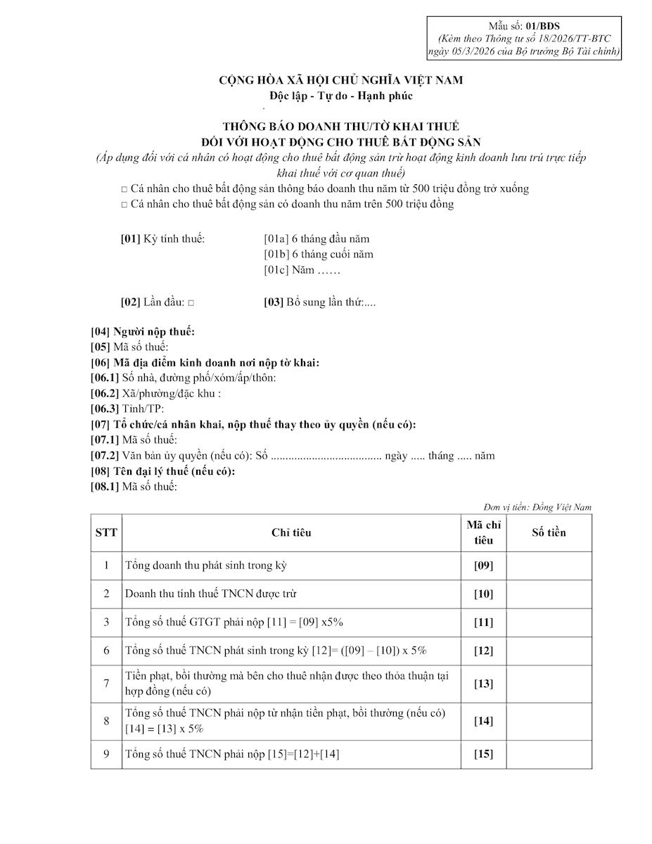 Mẫu 01/BĐS - Tờ khai thuế cho thuê tài sản. Xem chi tiết và tải tại đây.