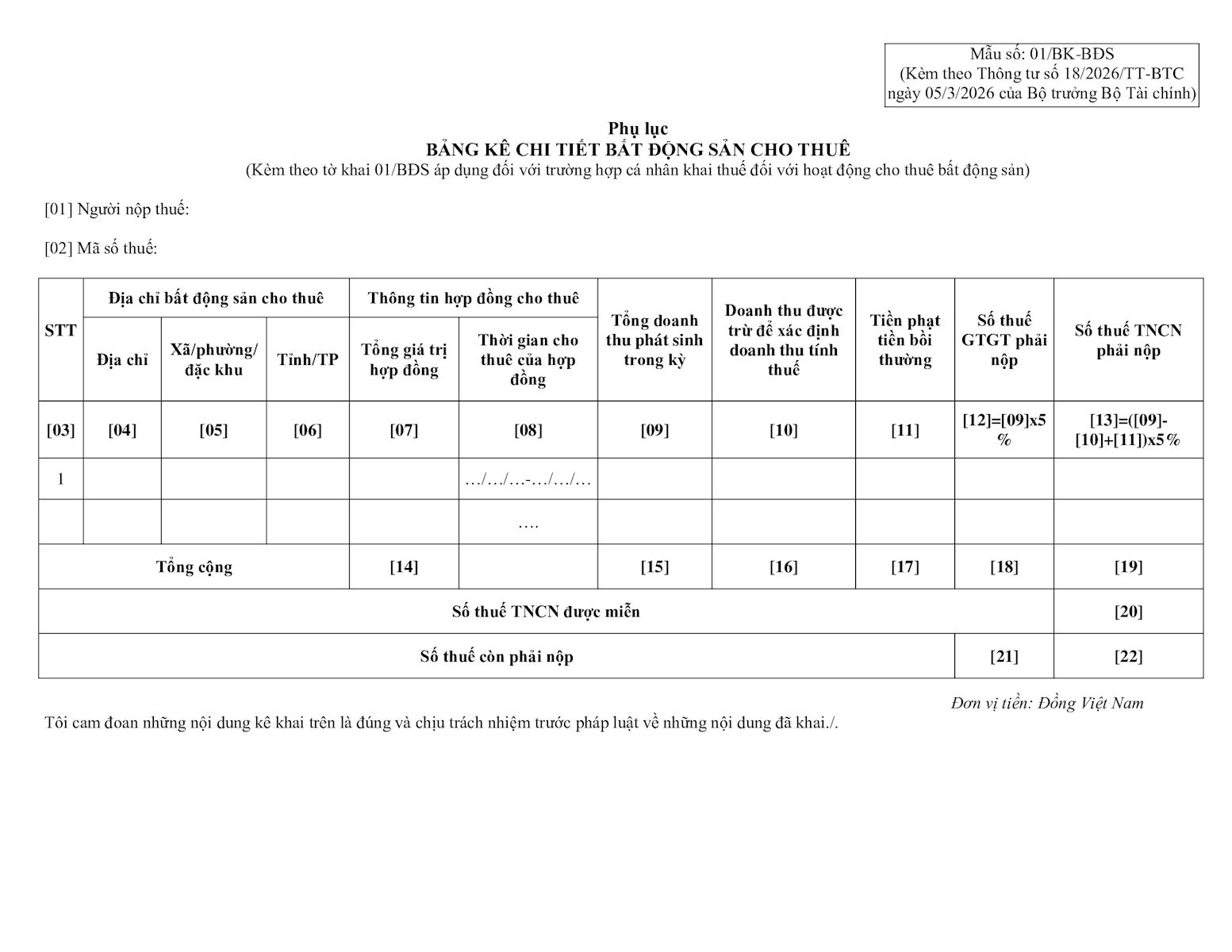 • Mẫu 01/BK-BĐS - Phụ lục bảng kê chi tiết BĐS cho thuê.