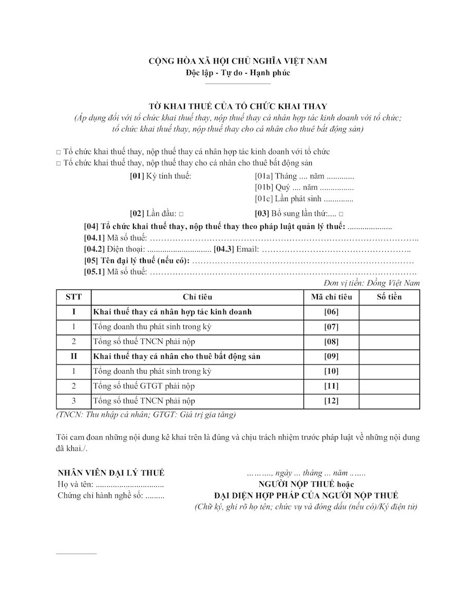 Mẫu 01/TCKT - Tờ khai thuế cho thuê bất động sản. Xem chi tiết và tải tại đây.