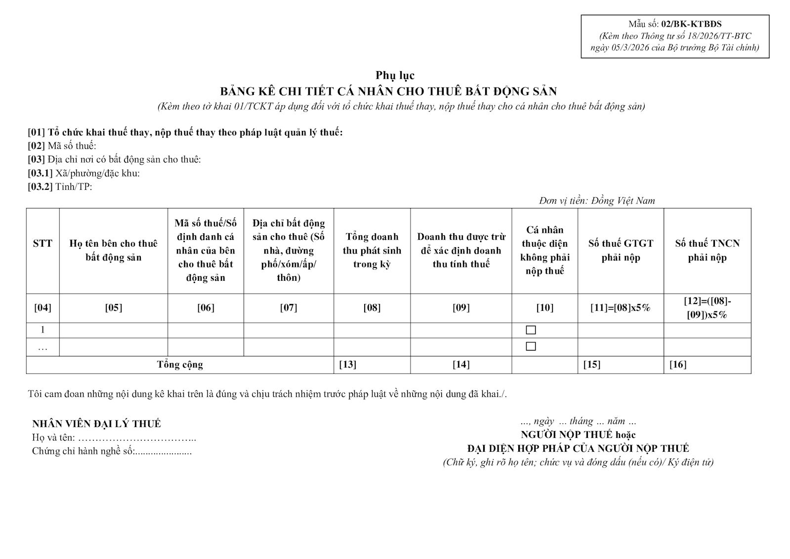 • Mẫu 02/BK-KTBĐS - Phụ lục bảng kê chi tiết BĐS cho thuê