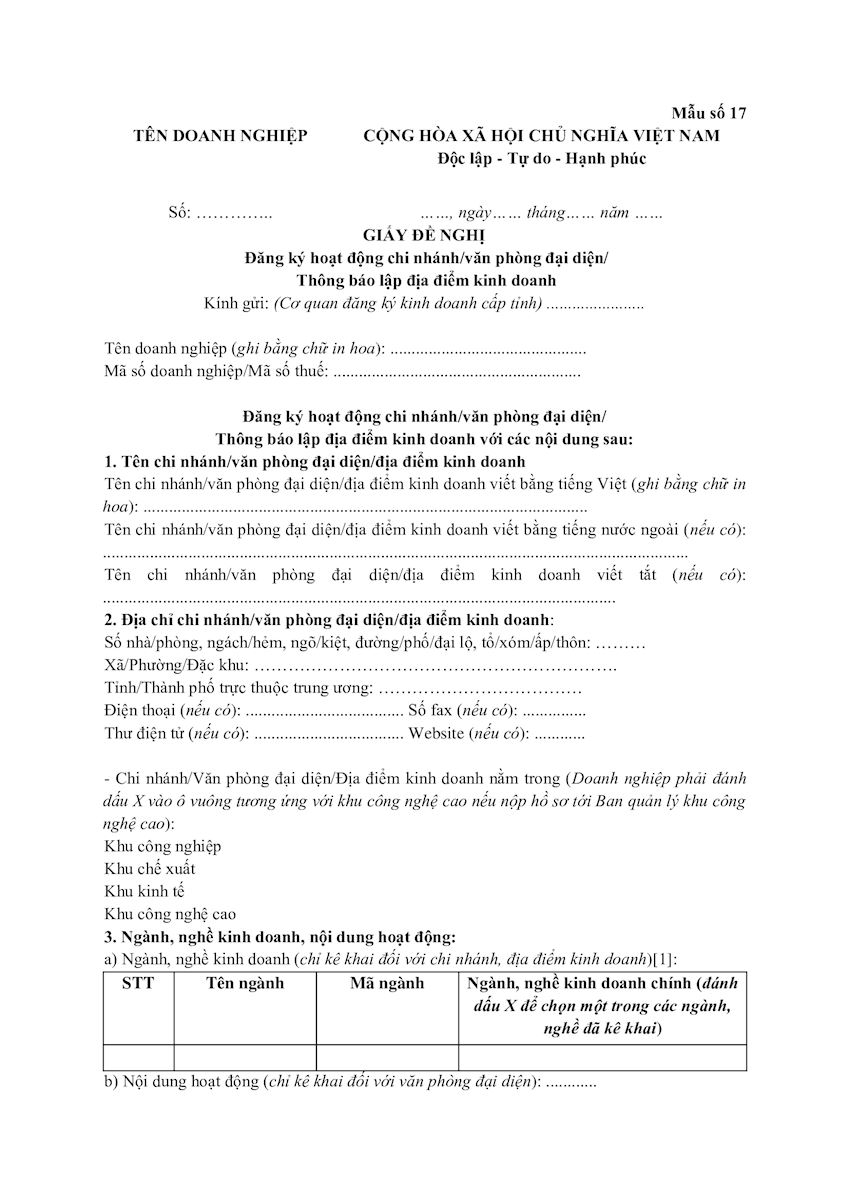 Thông báo thành lập địa điểm kinh doanh cho doanh nghiệp (Mẫu mới theo Thông tư 68/2025/TT-BTC)