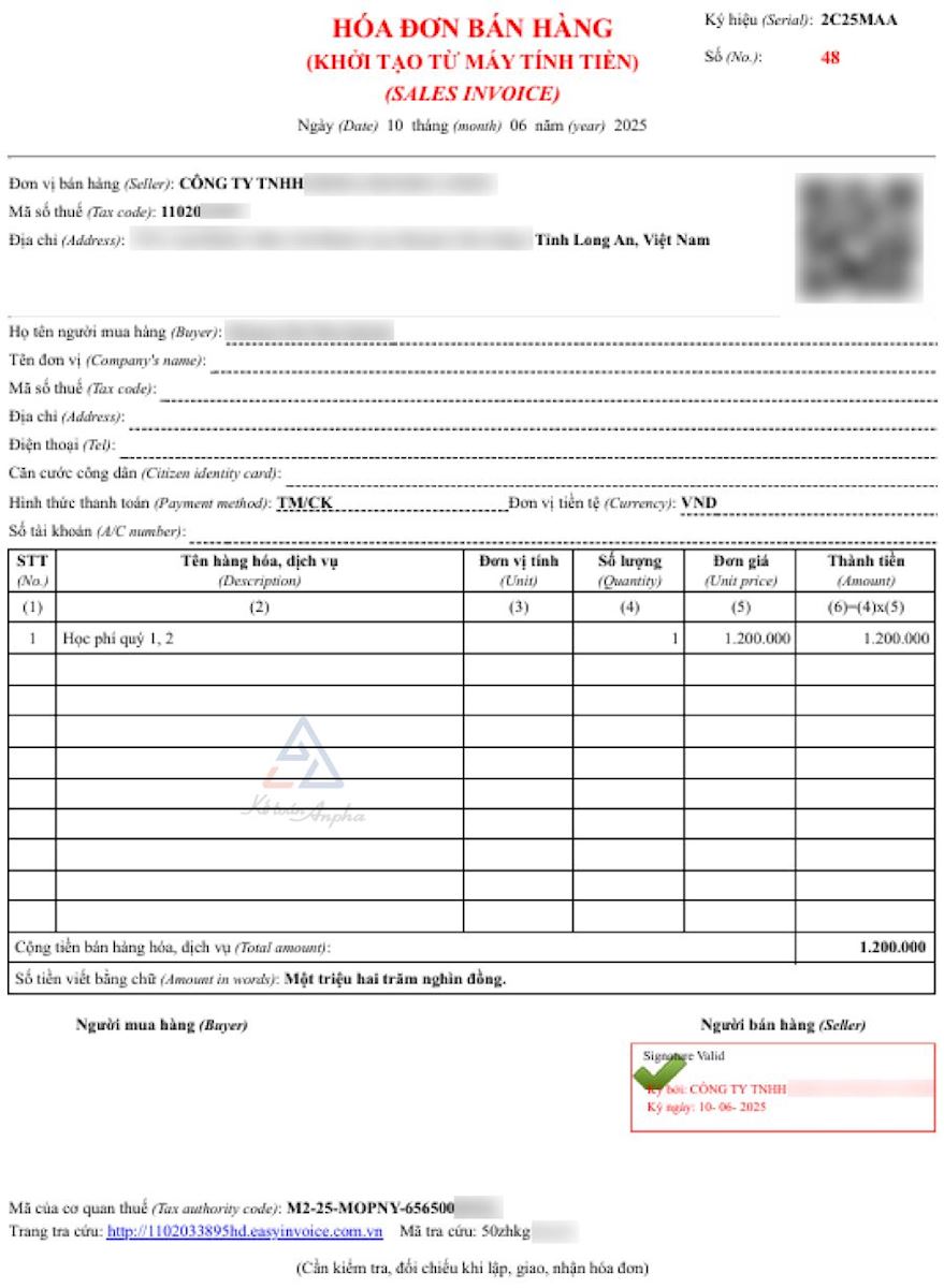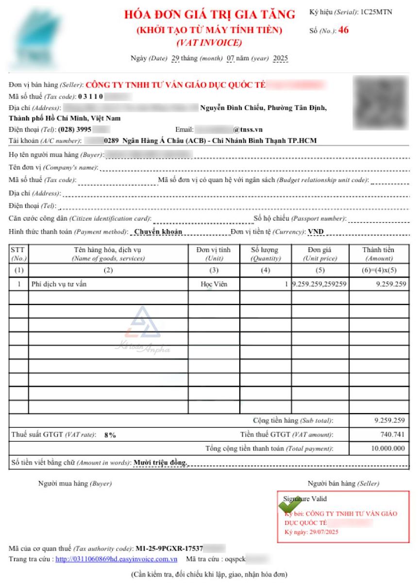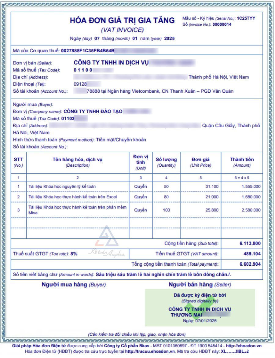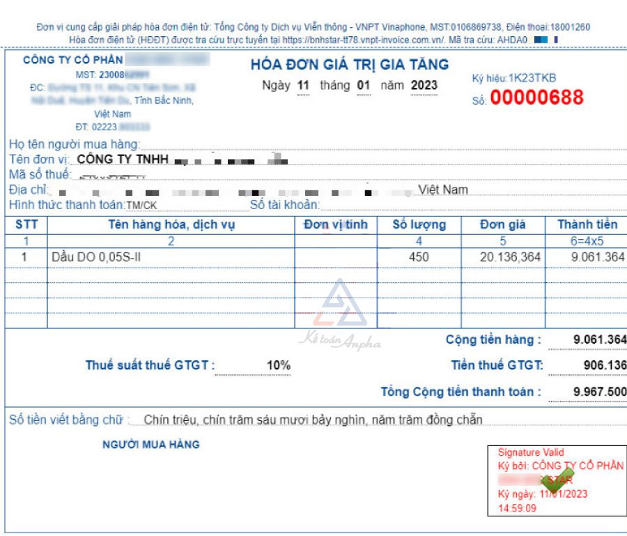 - Nội dung đầy đủ, chi tiết gồm: MST, tên hàng hóa, đơn giá, thuế suất, số tiền thuế, tổng thanh toán…