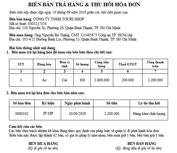 Ví dụ: Ngày 05/09/2018, Công ty Touri Shop có bán cho Ông Nguyễn Bá Thắng 100 cái áo với giá trị 2.200.000 đồng, đã bao gồm thuế VAT và xuất hóa đơn GTGT số 0000102 ký hiệu JP/18P. Nhưng đến ngày 10/09/2018 Ông Thắng phát hiện số hàng trên bị lỗi, kém chất lượng, Ông Thắng trả lại toàn bộ hàng, 2 bên thực hiện: Lập biên bản trả lại hàng và thu hồi hóa đơn như sau: