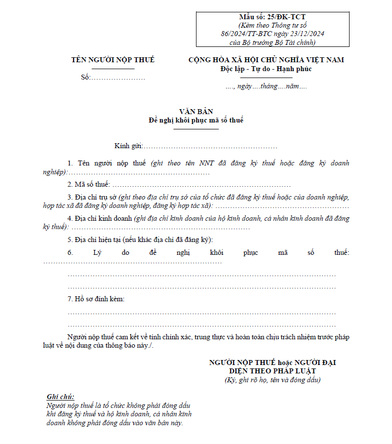 Mẫu số 25/ĐK-TCT ban hành kèm Thông tư số 86/2024/TT-BTC (mẫu mới nhất)