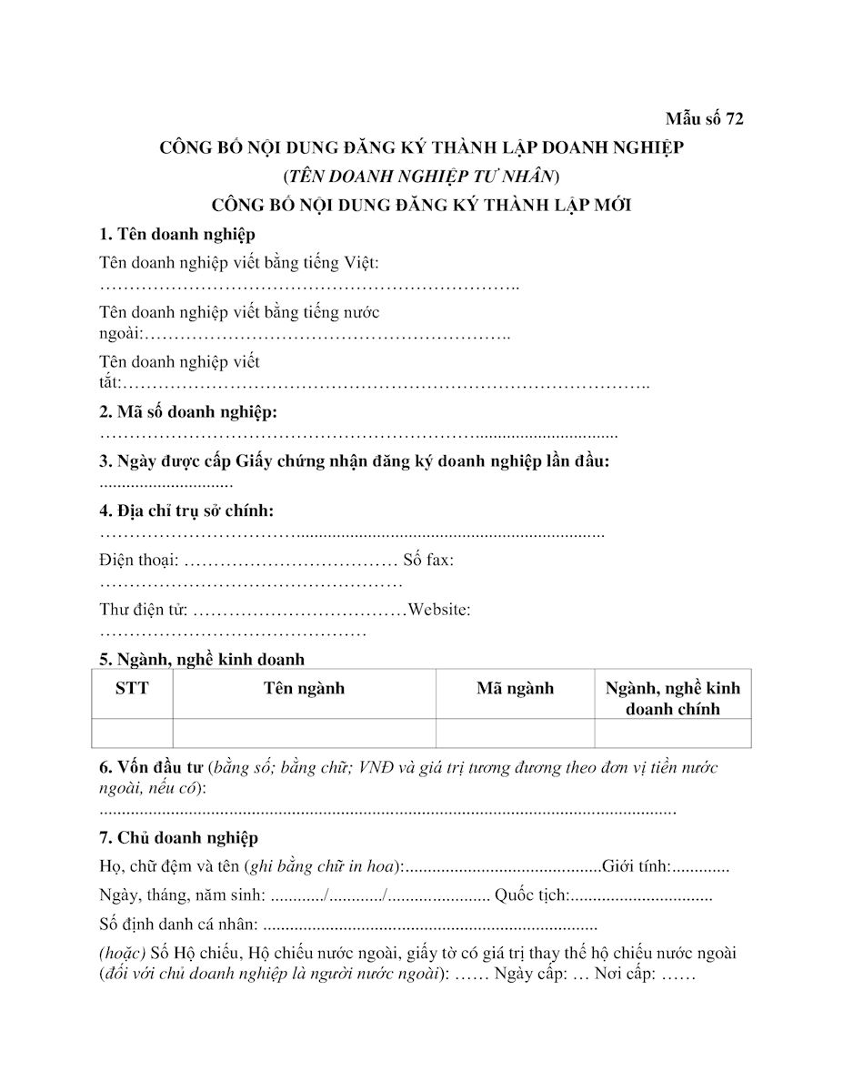 Mẫu số 72 - Công bố nội dung đăng ký thành lập doanh nghiệp