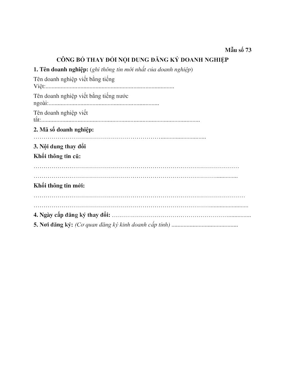 Mẫu số 73 - Công bố thay đổi nội dung đăng ký doanh nghiệp
