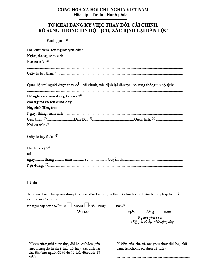 Mẫu tờ khai đăng ký việc thay đổi, cải chính, bổ sung thông tin hộ tịch, xác định lại dân tộc