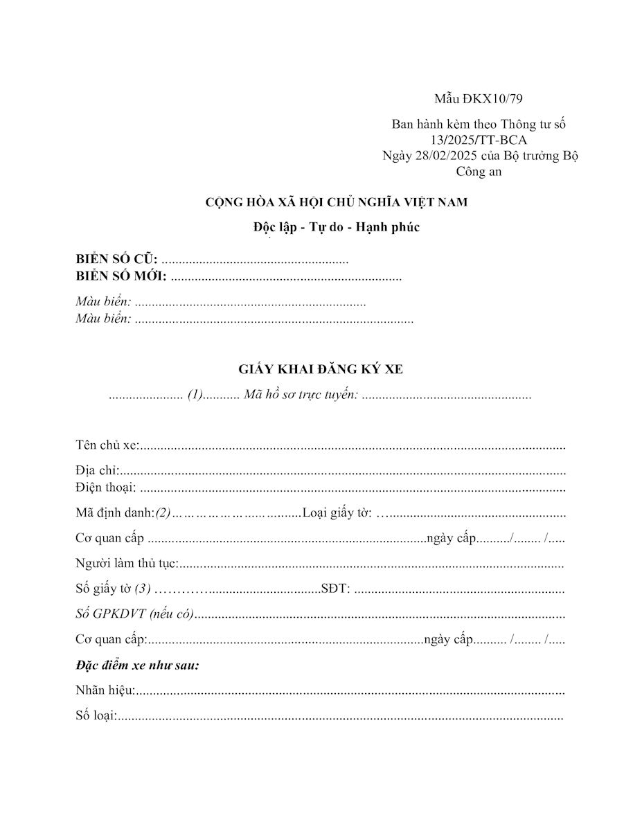 Mẫu tờ khai đăng ký xe ĐKX10/79