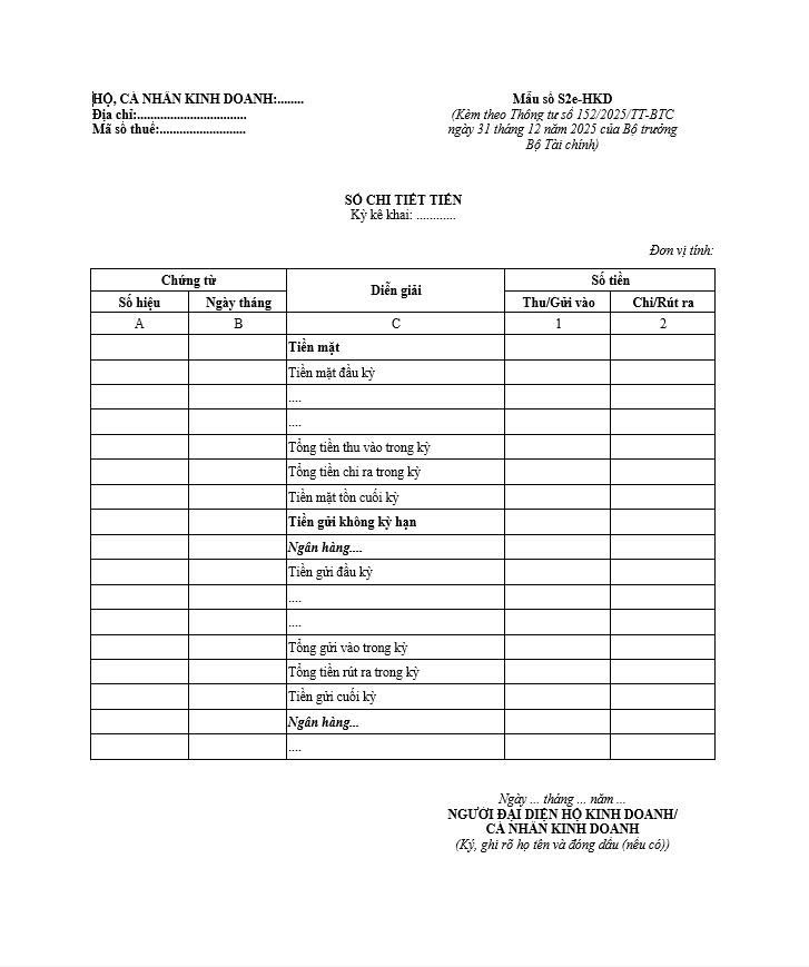 Sổ chi tiết tiền - Mẫu số S2e-HKD