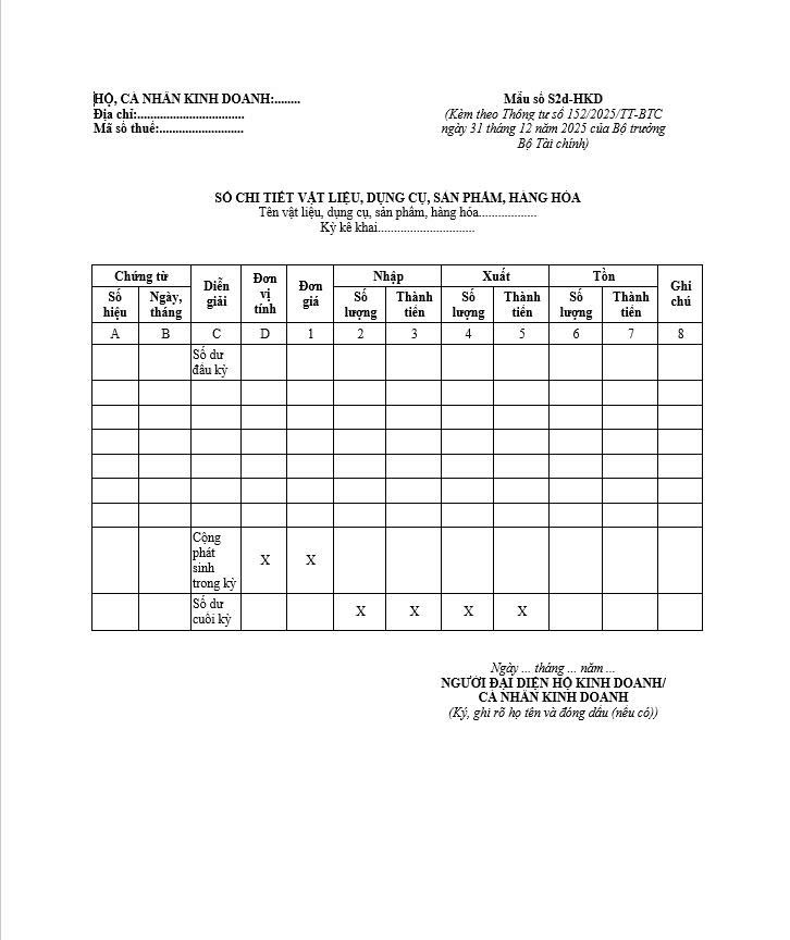Sổ chi tiết vật liệu, dụng cụ, sản phẩm, hàng hóa - Mẫu số S2d-HKD