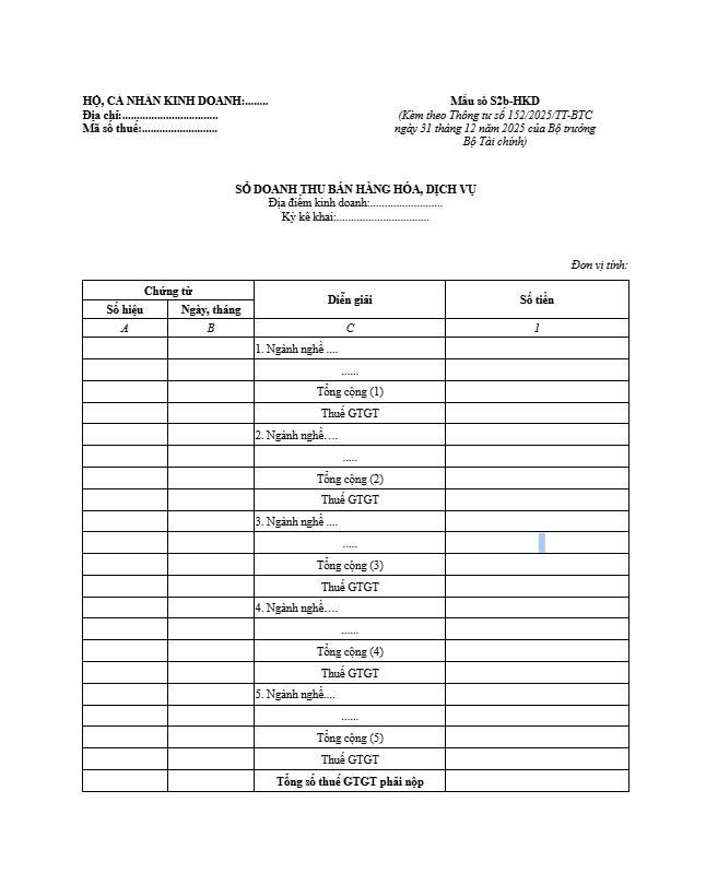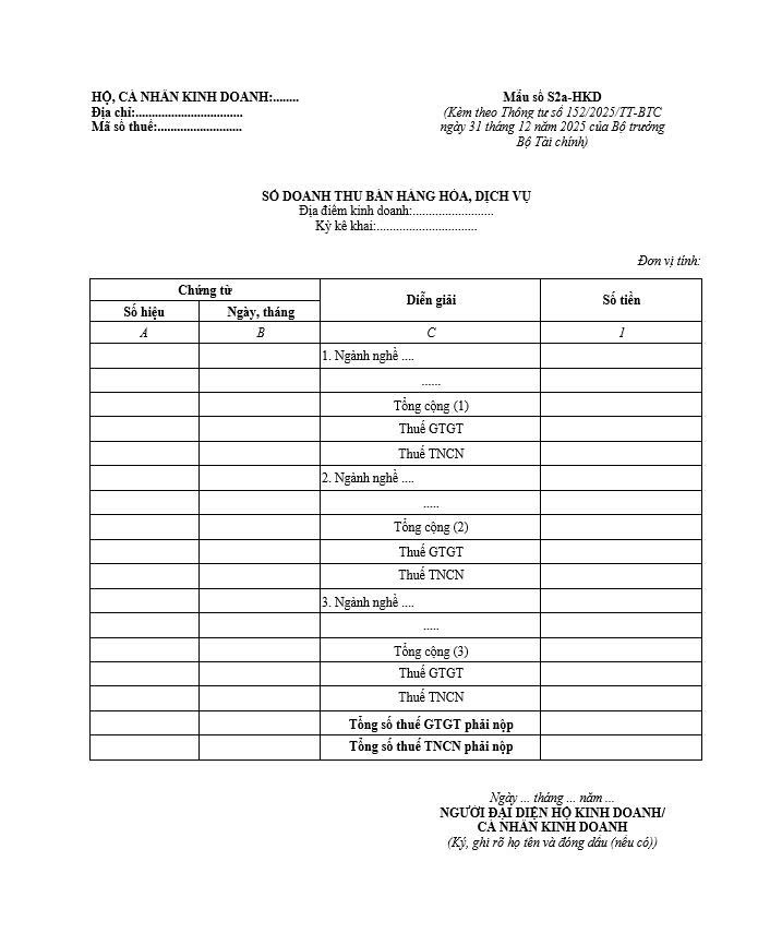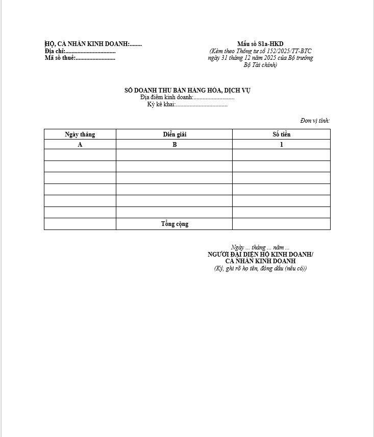 Sổ doanh thu bán hàng hóa, dịch vụ - Mẫu số S1a-HKD, S2a-HKD & S2b-HKD