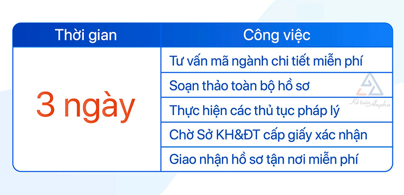 3 ngày để Sở KH&ĐT cấp giấy xác nhận về việc thay đổi nội dung đăng ký doanh nghiệp và Anpha bàn giao tận nơi cho khách hàng.