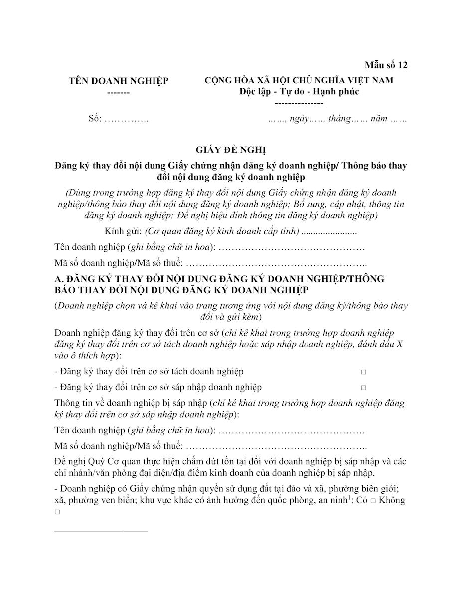 Mẫu số 12-Pl1 Giấy đề nghị đăng ký thay đổi nội dung Giấy chứng nhận đăng ký doanh nghiệp/ Thông báo thay đổi nội dung đăng ký doanh nghiệp (mẫu mới nhất)