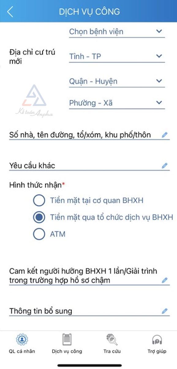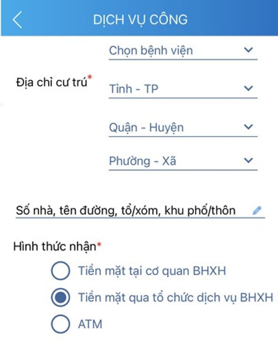 - Trường hợp nhận tiền mặt: Tích chọn ô “Nhận bằng tiền mặt” và điền địa chỉ nhận lương hưu/nơi cư trú mới;