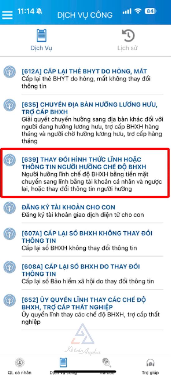 ➧ Bước 2: Chọn mục “[639] THAY ĐỔI HÌNH THỨC LĨNH HOẶC THÔNG TIN NGƯỜI HƯỞNG CHẾ ĐỘ BHXH”;