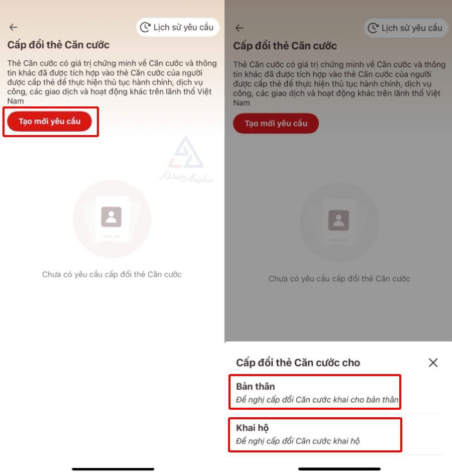 ➧ Bước 2: Chọn “Tạo mới yêu cầu” ➜ chọn ‘Bản thân” hoặc “Khai hộ” tùy vào nhu cầu cấp đổi.