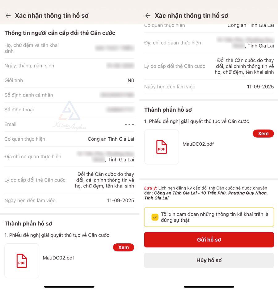 ➧ Bước 4: Màn hình hiển thị thông tin của người yêu cầu cấp đổi thẻ căn cước, bạn kiểm tra lại thông tin và tích chọn vào ô “Tôi xin cam đoan…” ➜ nhấn “Gửi hồ sơ” để hoàn tất đăng ký.