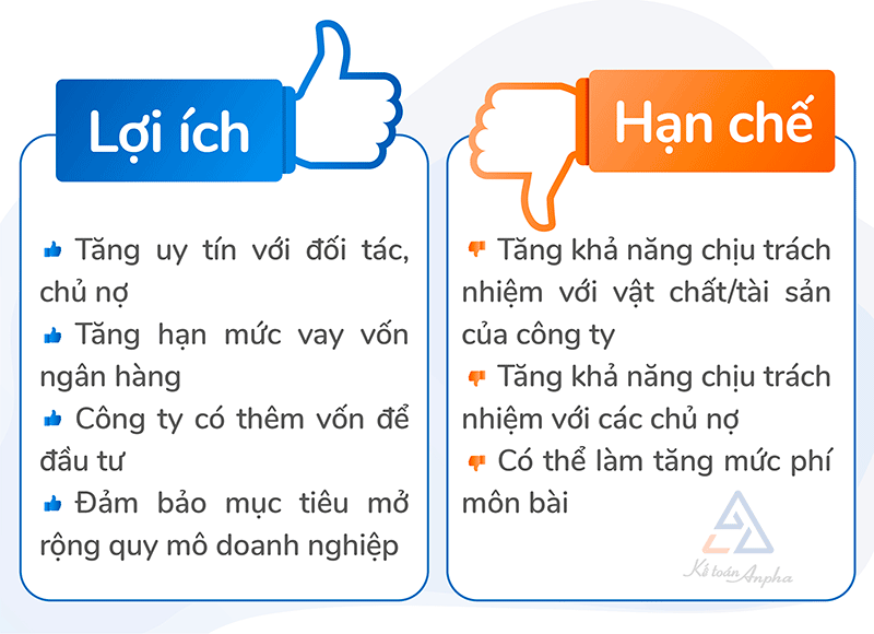 Việc thực hiện tăng vốn điều lệ của doanh nghiệp nhằm nhu cầu mở rộng quy mô hoạt động kinh doanh của doanh nghiệp. Việc tăng vốn điều lệ mang lại những lợi ích và hạn chế sau cho doanh nghiệp: