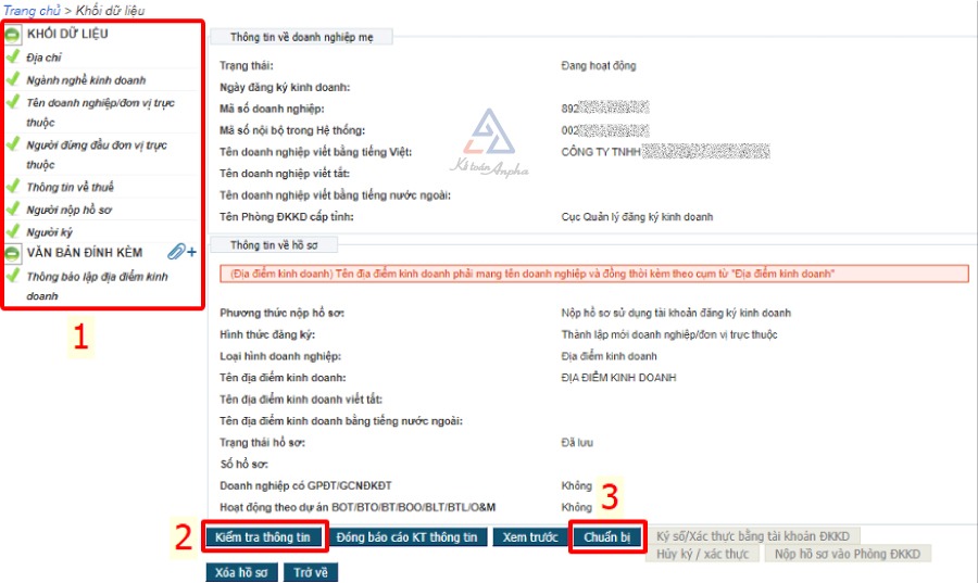 - Nhập đầy đủ các thông tin theo yêu cầu trên “KHỐI DỮ LIỆU” ➜ Tải lên file thông báo thành lập địa điểm kinh doanh tại mục “VĂN BẢN ĐÍNH KÈM”;
