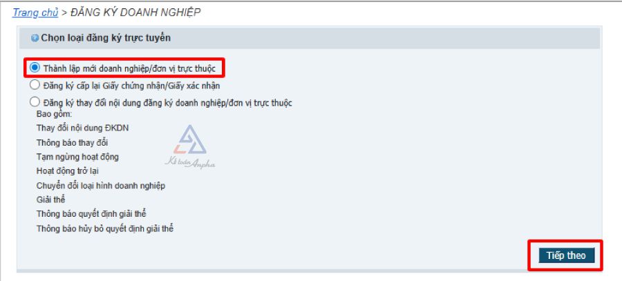 ➤ Bước 2: Chọn “Thành lập doanh nghiệp mới/đơn vị trực thuộc” và bấm “Tiếp theo”;