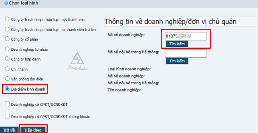 ➤ Bước 3: Chọn “Địa điểm kinh doanh” ➜ Nhập mã số doanh nghiệp ➜ Bấm “Tìm kiếm” ➜ Kiểm tra thông tin doanh nghiệp và bấm “Tiếp theo”;
