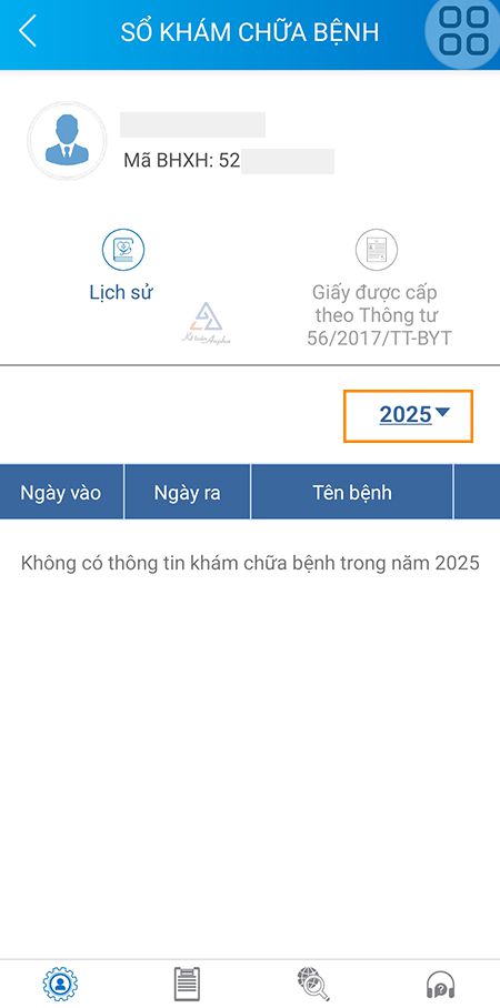 Bạn cần đăng nhập VssID → chọn mục “Sổ khám chữa bệnh” để xem lịch sử khám chữa bệnh theo từng năm. Bạn có thể chọn năm muốn xem để tra cứu chi tiết thông tin khám, ngày vào - ra viện, chẩn đoán và chứng từ liên quan.